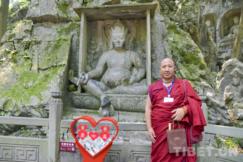 “雖然我已經(jīng)在飛來峰講解了許多年,但始終不知道這尊藏傳佛教財神爺在藏語中的發(fā)音怎么讀,今天有幸向各位請教。”在靈隱寺飛來峰的理公塔旁,一處坐南朝北、呈縱長形的佛龕內(nèi)供奉著一尊菩薩坐像,這是元代所雕刻出的藏傳佛教黃財神造像。隨團導(dǎo)游小李正趁此機會向來自西藏的師生們請教,來自西藏的他們亦同樣為在杭州能看到如此大規(guī)模的藏傳佛教造像感到驚訝。