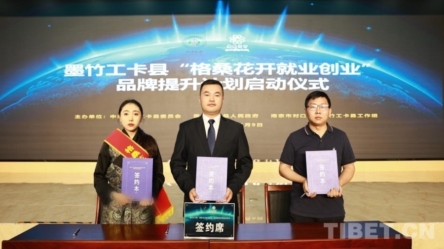 圖為貢覺卓瑪(左一)參加墨竹工卡縣舉辦的“格桑花開就業(yè)創(chuàng)業(yè)”品牌提升計劃啟動儀式并簽訂合作協(xié)議