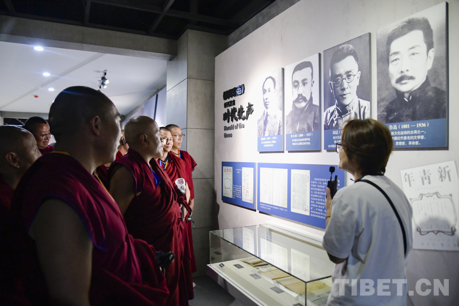 圖為在嘉興五四文化博物館內(nèi)西藏佛學院師生認真聆聽關于五四運動的講解 攝影:趙振宇