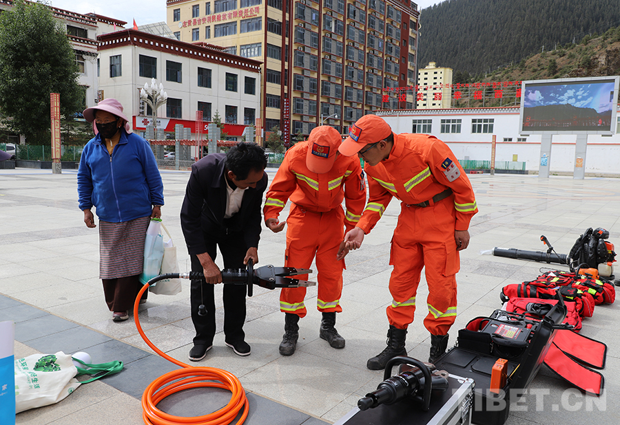 “這是我們最新配發(fā)的液壓擴(kuò)張器和液壓剪切器,主要用于打開救援通道……”在裝備展示區(qū),消防員土登旺堆正在為群眾詳細(xì)講解液壓剪切器、液壓頂撐器、生命探測(cè)儀等各類救援裝備的特點(diǎn)和使用方法,并邀請(qǐng)群眾進(jìn)行親身體驗(yàn)。