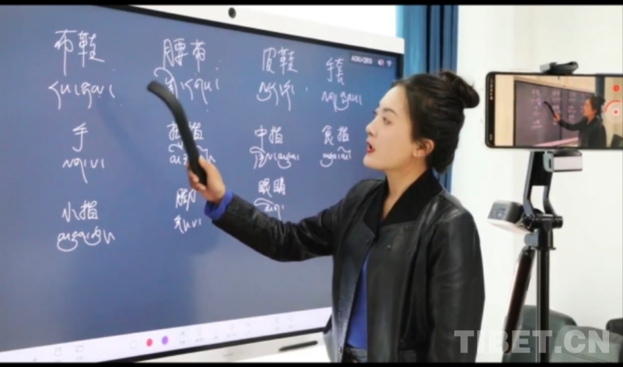 圖為次仁嘎措在給當?shù)啬撩窠套R字 受訪者供圖