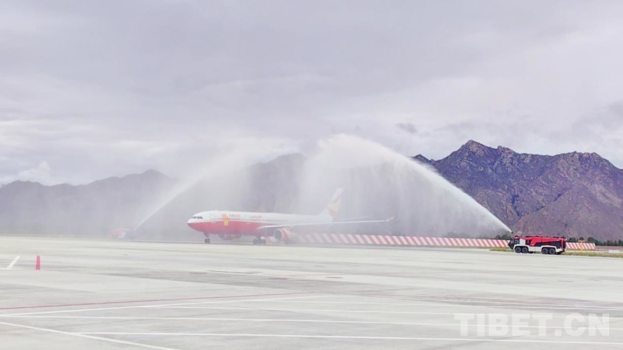 圖為8L9669航班在拉薩貢嘎國際機場穿過“水門”