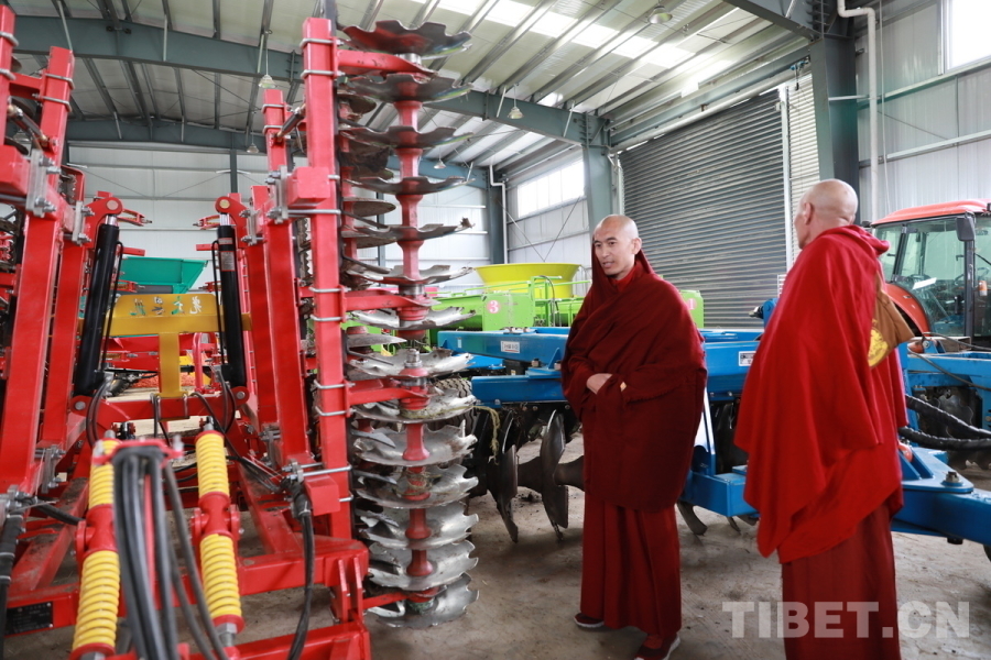 圖為甘孜縣甘孜寺的僧人江陽克珠(左)正在觀察大型現代化農業(yè)機械 攝影:劉莉