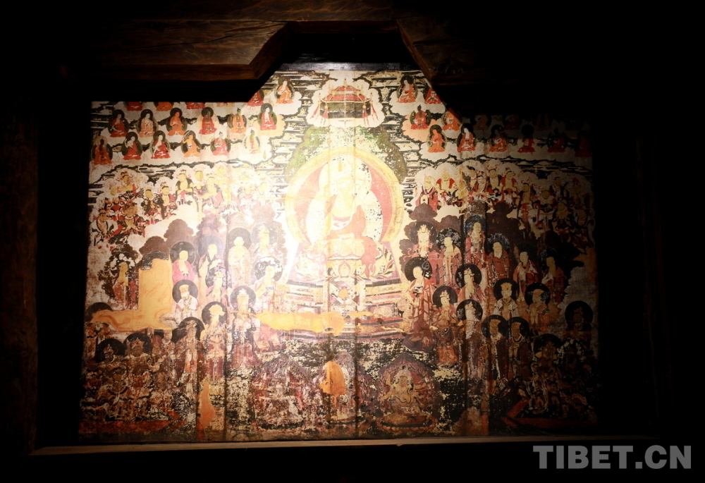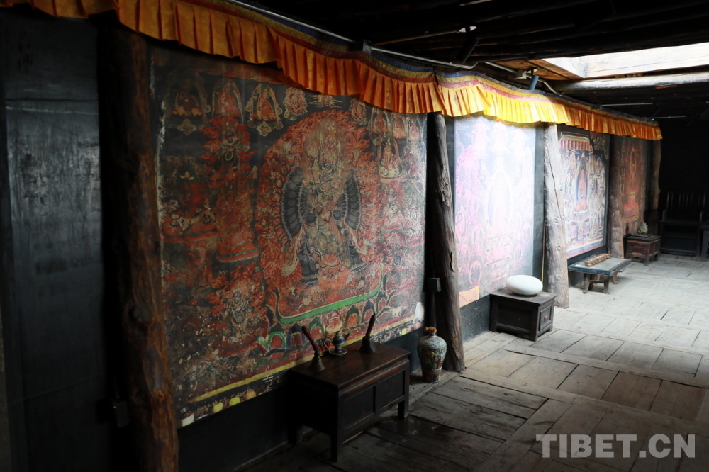 宗薩木府最驚艷的是其經(jīng)堂中歷經(jīng)380余年歷史仍色彩絢麗、保存完整的整堂壁畫。新中國成立后,宗薩木府曾被收歸公有,許多無房的當(dāng)?shù)刎毨罕姳话才抛∵M(jìn)了這里。“文革”時期,宗薩木府的經(jīng)堂被作為村里的倉庫,人們用報(bào)紙糊住壁畫,使這些藝術(shù)珍品沒有受到“破四舊”的影響。