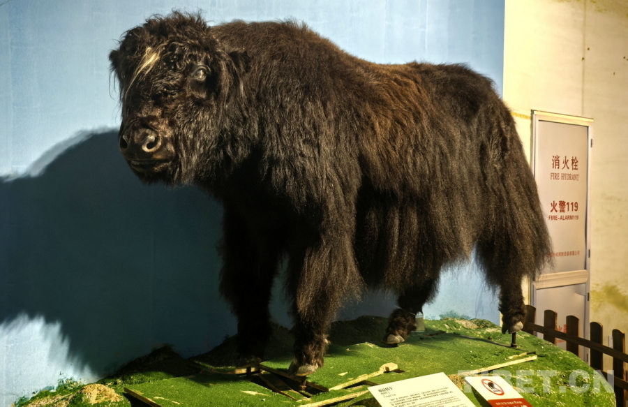 “金絲野牦牛體型壯碩,比一般家養(yǎng)牦牛大得多,牛角也大得多,再加上一身金色的毛發(fā),讓它們在高原上顯得格外威風凜凜。這兩頭金絲野牦牛標本都是用阿里地區(qū)林草局將自然死亡的標本材料無償捐贈制作的。小一點的這頭接近20歲,屬于高壽了,大一些的這頭大約16-17歲,年齡也比較大。”西熱說。