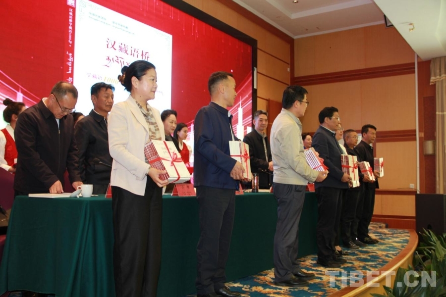 中國(guó)西藏網(wǎng)訊 在喜迎西藏自治區(qū)成立60周年之際,8月13日,《漢藏語(yǔ)橋:學(xué)藏語(yǔ)1000句+》新書發(fā)布會(huì)暨贈(zèng)書儀式在拉薩舉行?;顒?dòng)現(xiàn)場(chǎng),西藏自治區(qū)政府副主席、自治區(qū)藏語(yǔ)委副主任甲熱·洛桑丹增等向自治區(qū)藏語(yǔ)委成員單位、相關(guān)單位及街道、社區(qū)、村居代表贈(zèng)送《漢藏語(yǔ)橋:學(xué)藏語(yǔ)1000句+》570冊(cè)。