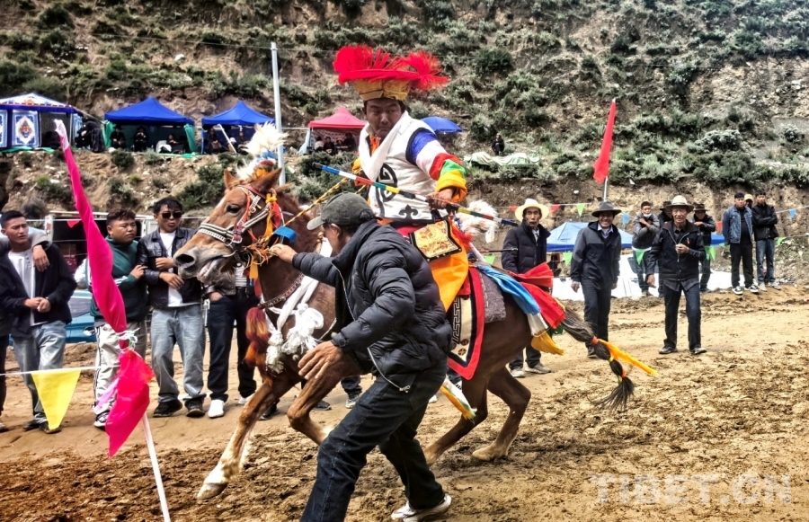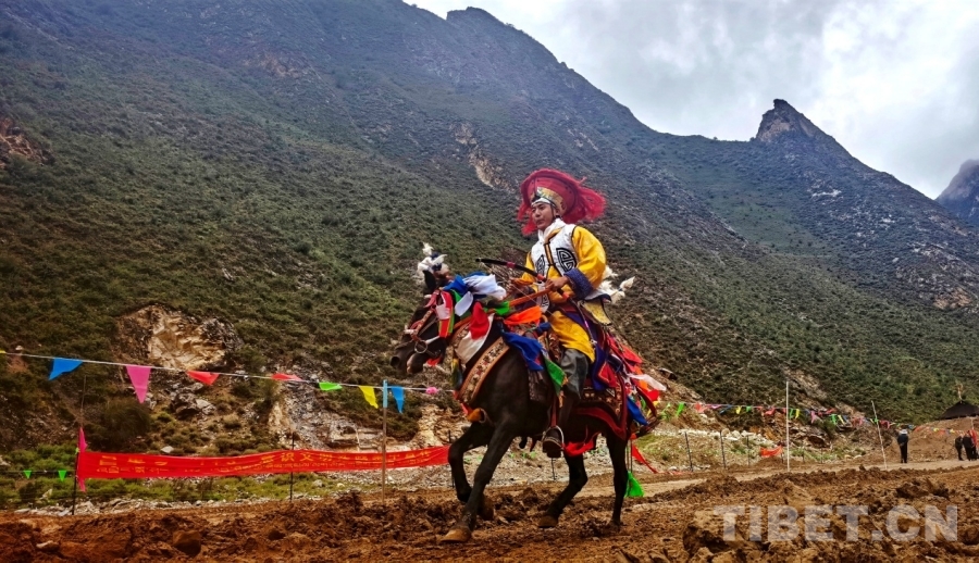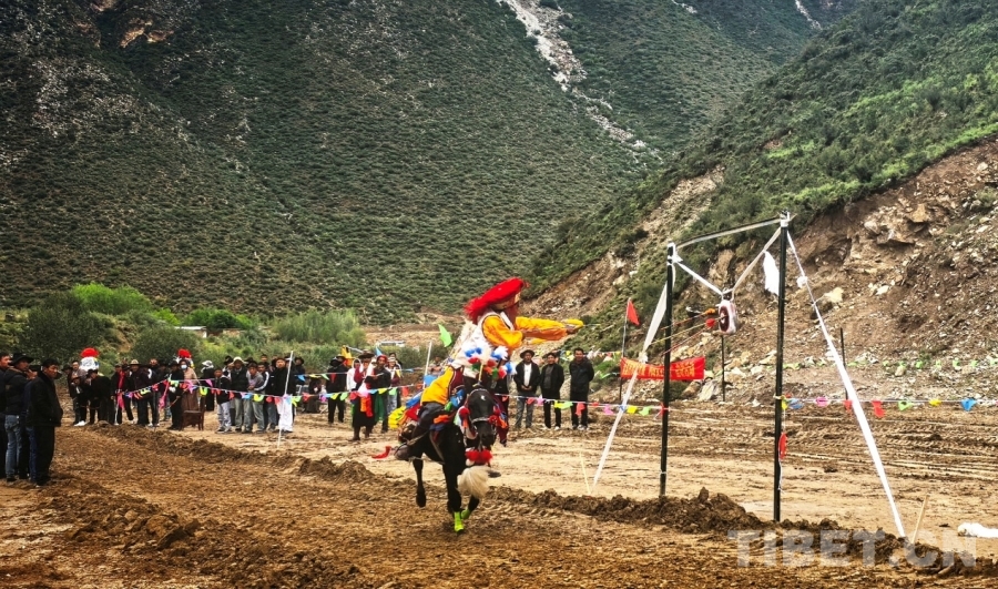 圖為西藏自治區(qū)山南市貢嘎縣昌果鄉(xiāng)普夏村望果節(jié)賽馬會現(xiàn)場,騎手正在參加騎馬射箭比賽 攝影:劉莉