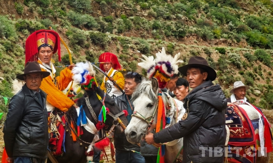 圖為西藏自治區(qū)山南市貢嘎縣昌果鄉(xiāng)普夏村望果節(jié)賽馬會現(xiàn)場,年長村民正在指導年青騎手射箭要領 攝影:劉莉