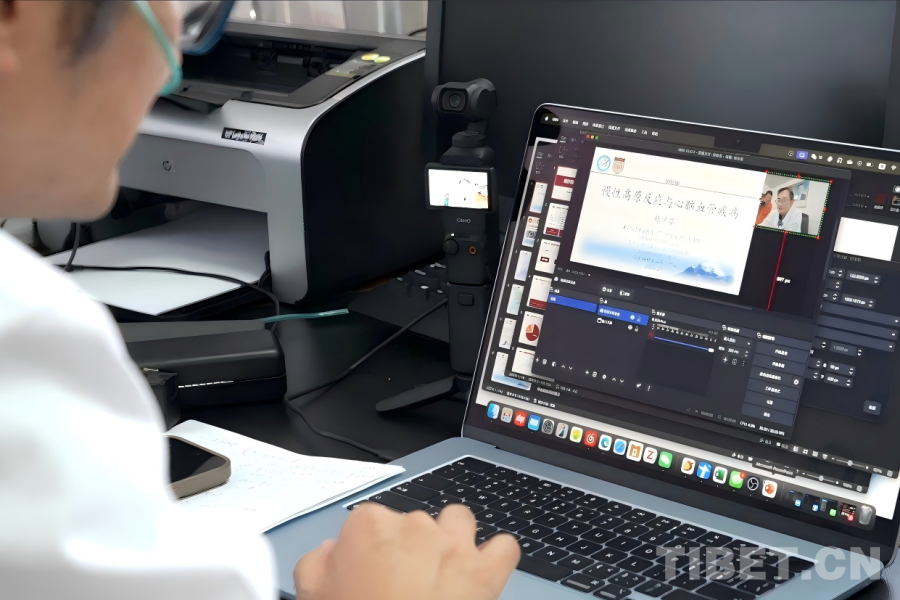 在阿里地區(qū)人民醫(yī)院的行政樓辦公室內(nèi),來自上海華山醫(yī)院神經(jīng)外科、作為第25批“博士服務(wù)團(tuán)”成員援藏的主治醫(yī)師杜倬嬰,正專注研究一項(xiàng)“新技術(shù)”。桌面上,一臺(tái)口袋相機(jī)運(yùn)行著,旁邊電腦屏幕上同步顯示相機(jī)所拍攝的畫面,同時(shí)呈現(xiàn)的還有一份關(guān)于高原反應(yīng)與心腦血管疾病的課程講義?!斑@是一套直播系統(tǒng),不過我現(xiàn)在還在學(xué)習(xí)怎么使用?!爆F(xiàn)任阿里地區(qū)人民醫(yī)院黨委委員、副院長(zhǎng)的杜倬嬰笑著展示初見雛形的成果。
