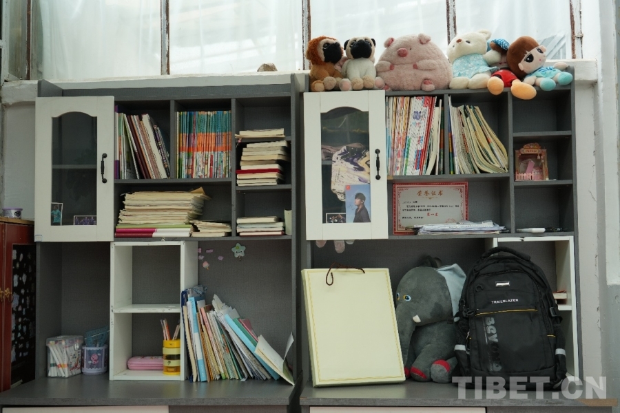 圖為羅啟明、尼吉女兒的書(shū)桌,右下角為中央代表團(tuán)阿里分團(tuán)贈(zèng)送的書(shū)包 攝影:馮重霖