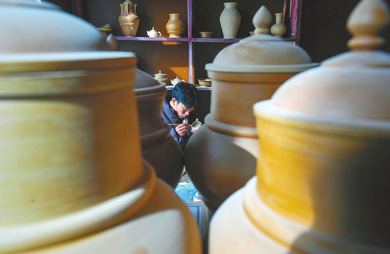 12月的冬日陽(yáng)光透過(guò)壤巴拉藏式陶藝傳習(xí)所的窗口,在飛轉(zhuǎn)的泥坯上折射出金色的光芒。在四川省阿壩藏族羌族自治州壤塘縣上壤塘鄉(xiāng)仁棚村的這間陶藝傳習(xí)所,澤郎斯加正在陶器原型上修坯。澤郎斯加和傳習(xí)所的18名學(xué)員,都來(lái)自于壤塘縣貧困牧民家庭,經(jīng)過(guò)六年的學(xué)習(xí)和進(jìn)修,他們?cè)谔账噦髁?xí)所已熟練掌握了藏陶的拉坯、修坯、燒制等綜合技藝,并完成了德育、藏文、漢語(yǔ)、數(shù)學(xué)、電子商務(wù)、藏漢文書(shū)法、基礎(chǔ)繪畫(huà)等課程培訓(xùn)。