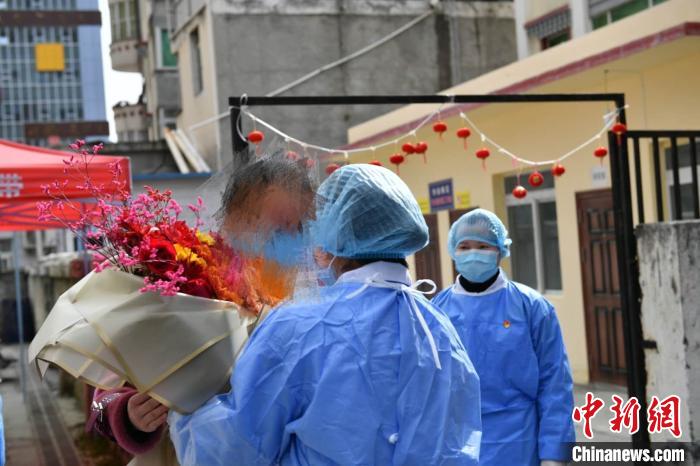 醫(yī)護人員向郭某某送上鮮花?!≈芡?攝