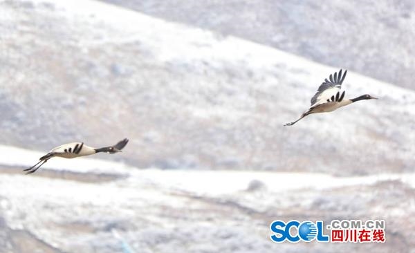 黑頸鶴是世界上唯一生長(zhǎng)和繁殖在高原的鶴。每年3月至11月,在阿壩州若爾蓋、紅原兩縣,總能見(jiàn)到成群的黑頸鶴在此繁衍棲息。其中,有“中國(guó)黑頸鶴之鄉(xiāng)”稱號(hào)的若爾蓋縣現(xiàn)有1000多只黑頸鶴,是世界上黑頸鶴分布數(shù)量最多、繁殖地面積最大的區(qū)域。