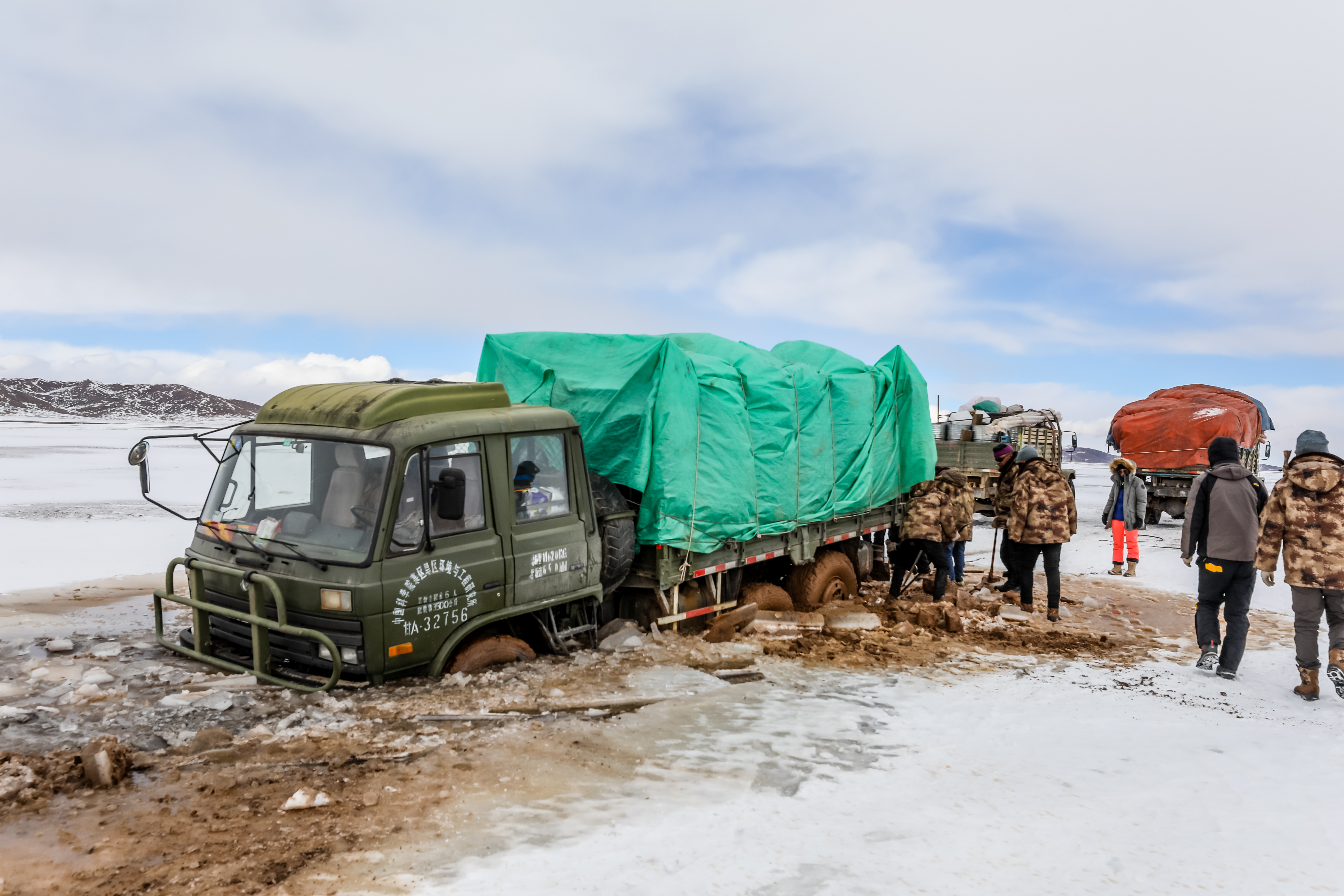 最后一次陷車臨近山的埡口,大雪掩蓋了尚未冰封凍實(shí)的小池塘。小型越野車通過(guò)后,大卡車順著車轍前行,深陷池塘。此時(shí)天已擦黑,狂風(fēng)呼嘯,科研人員只好把卡車上4噸的物品全部卸下,將車拖出,再進(jìn)行裝車?!傲阆率畮讛z氏度,5級(jí)風(fēng)的情況下,我們?cè)谀抢镎垓v了4個(gè)小時(shí)?!?/p>