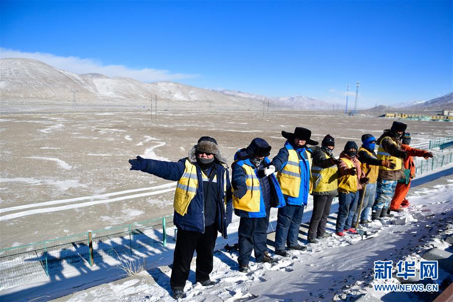 1月11日,在青藏鐵路望昆站附近,于本蕃(左一)和工友們在施工前進行安全檢查。新華社記者 張龍 攝