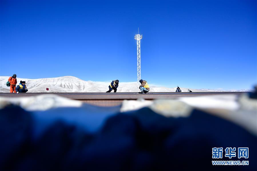 1月12日清晨,于本蕃(中)與工友在昆侖山口附近的青藏鐵路上施工。新華社記者 張龍 攝