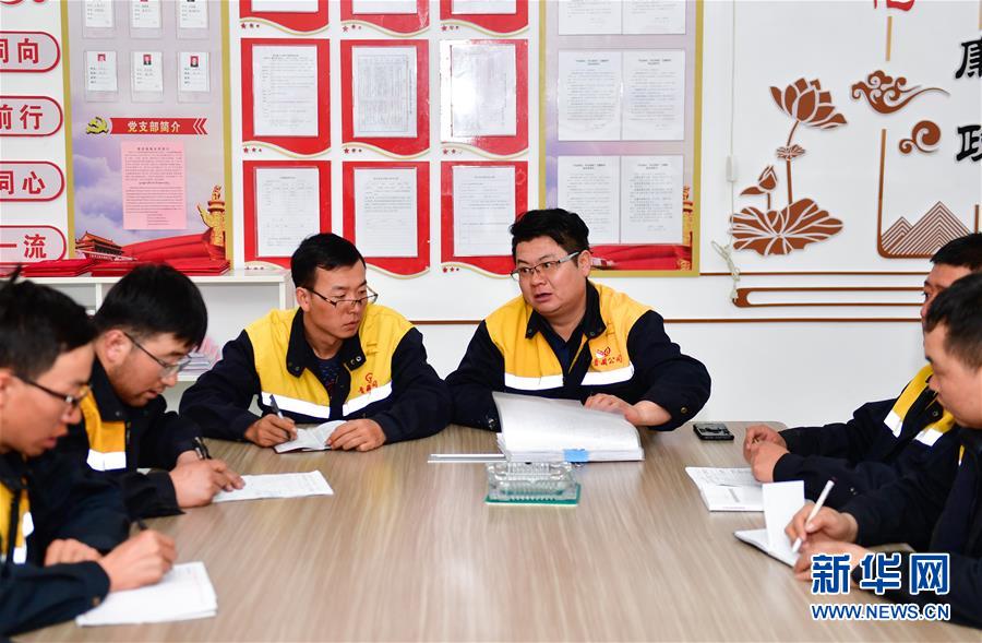 1月11日,在青藏鐵路望昆站,于本蕃(右三)召集工友開會商定施工方案。新華社記者 張龍 攝