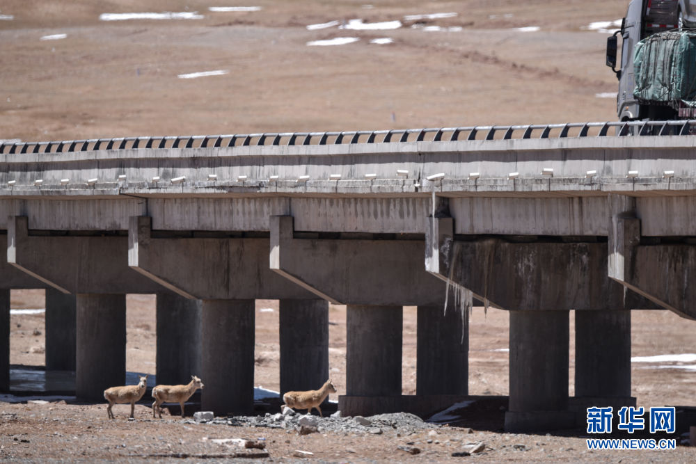 5月16日,幾只藏羚羊嘗試通過(guò)一座大橋,前往可可西里地區(qū)。新華社記者 吳剛 攝