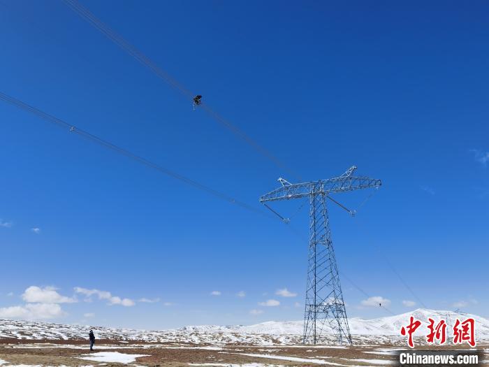 圖為5月13日,國網(wǎng)青海檢修公司輸電運檢人員在海拔五千米的風火山地區(qū)對“電力天路”±400千伏柴拉直流線路進行空中走線巡檢,查找并消除線路缺陷。謝莉蓉 攝