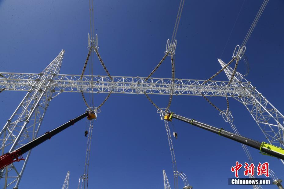 6月23日拍攝的青海省海南藏族自治州共和縣±800千伏特高壓青南換流站內(nèi)的驗收引流線。中新社記者 馬銘言 攝