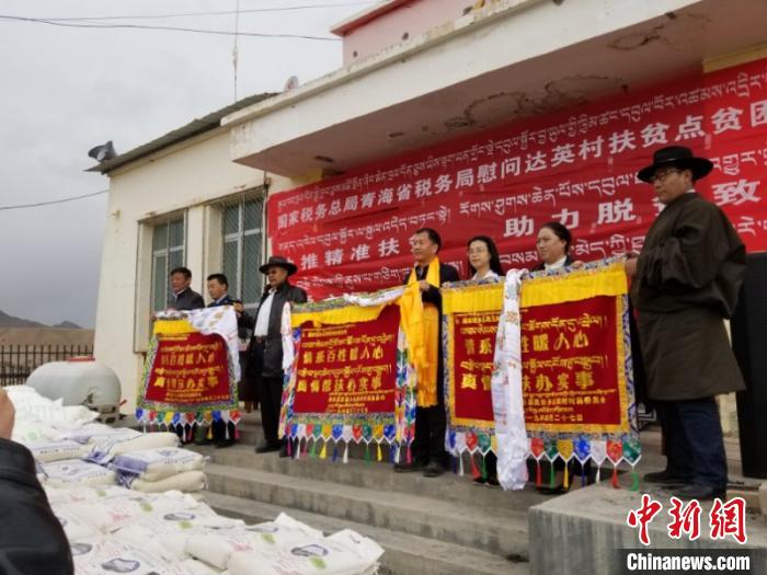 資料圖為青海省稅務局扶貧工作領導小組成員赴達英村捐贈物資。國家稅務總局青海省稅務局供圖