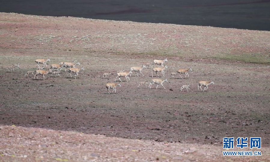 7月7日在可可西里卓乃湖區(qū)域拍攝的一群藏羚羊。新華社記者 張龍 攝
