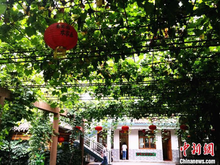 7月,中新網(wǎng)記者走進(jìn)韓謝軍的農(nóng)家樂(lè),庭院中滿是掛滿果實(shí)的葡萄架長(zhǎng)廊,葡萄枝葉連成片,濃密的樹蔭遮蔽了夏日炎炎。
