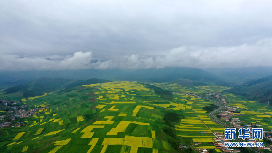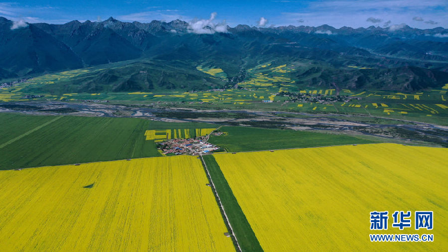 這是7月22日拍攝的門源回族自治縣境內(nèi)的油菜花田(無人機照片)。新華社記者 吳剛 攝