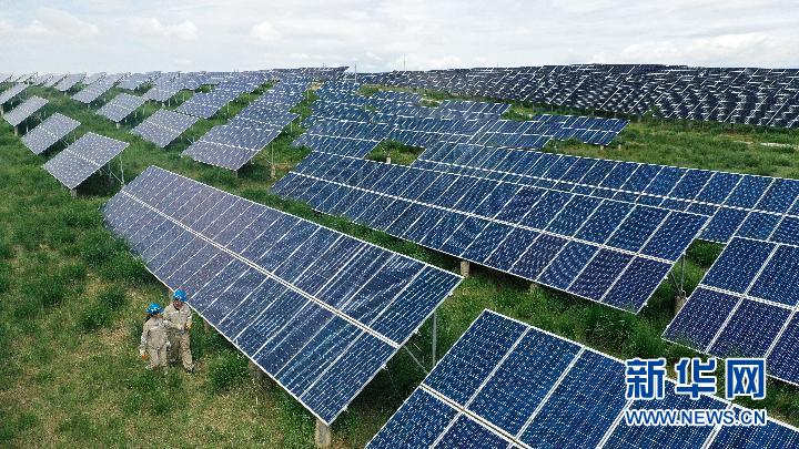 7月8日,在青海省海南藏族自治州共和縣,大唐青海公司新能源分公司兩名工作人員在光伏電站內(nèi)巡檢。新華社記者 張宏祥 攝