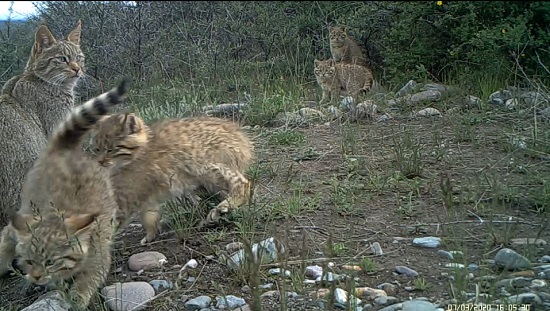 荒漠貓為中國所有貓科動物中僅有的特有物種,《世界自然保護(hù)聯(lián)盟》(IUCN)瀕危(EN)物種,荒漠貓在全國數(shù)量稀少,分布密度低,對其生活史所知甚少。其通常棲息于海拔2500米至5000米干燥的高山與亞高山灌叢、戈壁、草甸生境中。自祁連山國家公園青海省管理局啟動荒漠貓專項調(diào)查以來,在國家公園范圍內(nèi)頻繁記錄到荒漠貓活動畫面,并且記錄到一只雌性荒漠貓成功撫育4只幼崽的畫面,監(jiān)測到5只荒漠貓同框的罕見畫面。祁連山國家公園青海片區(qū)自開展貓科動物專項調(diào)查以來,記錄到5只雪豹同框、6只兔猻同框的罕見畫面后又一次記錄到貓科動物多只同框的畫面。