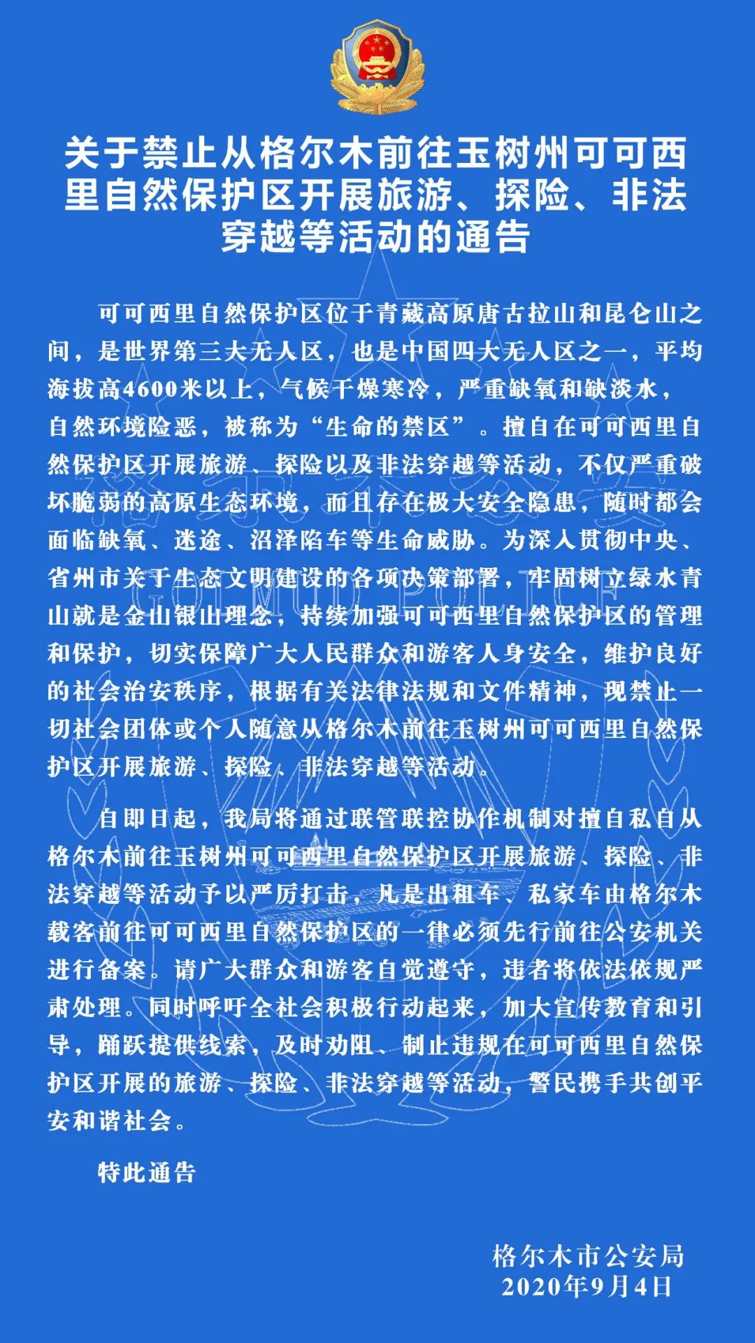 據(jù)格爾木公安微信公眾號消息,9月4日,青海省格爾木市公安局發(fā)布通告,禁止一切社會團體或個人隨意從格爾木前往玉樹州可可西里自然保護區(qū)開展旅游、探險、非法穿越等活動,即日起將對上述行為予以嚴厲打擊,凡是出租車、私家車由格爾木載客前往可可西里自然保護區(qū)的一律必須先行前往公安機關進行備案。