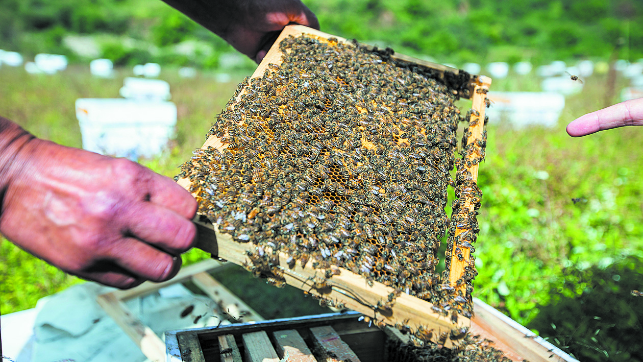 蜜蜂進場了,楊顯舉隔天就會打個電話到蜂場了解情況?!懊鄯溥m不適應(yīng),花源夠不夠?”得知第一次選址的基地連續(xù)遭遇“熊瞎子”時,他又緊急協(xié)調(diào)鄉(xiāng)上一起重新選址。遇到天氣突變,他也要打電話提醒……直到一個多月后,專家親口告訴他“今年每箱產(chǎn)量將超過30斤,而且品質(zhì)非常高”時,他這才把一顆懸著的心放回了肚子里。