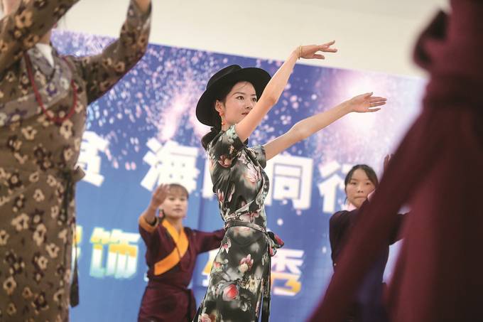 青海省海南州精準扶貧綠色產(chǎn)業(yè)發(fā)展園園區(qū)內模特們在展示民族服飾。 邵丹 攝