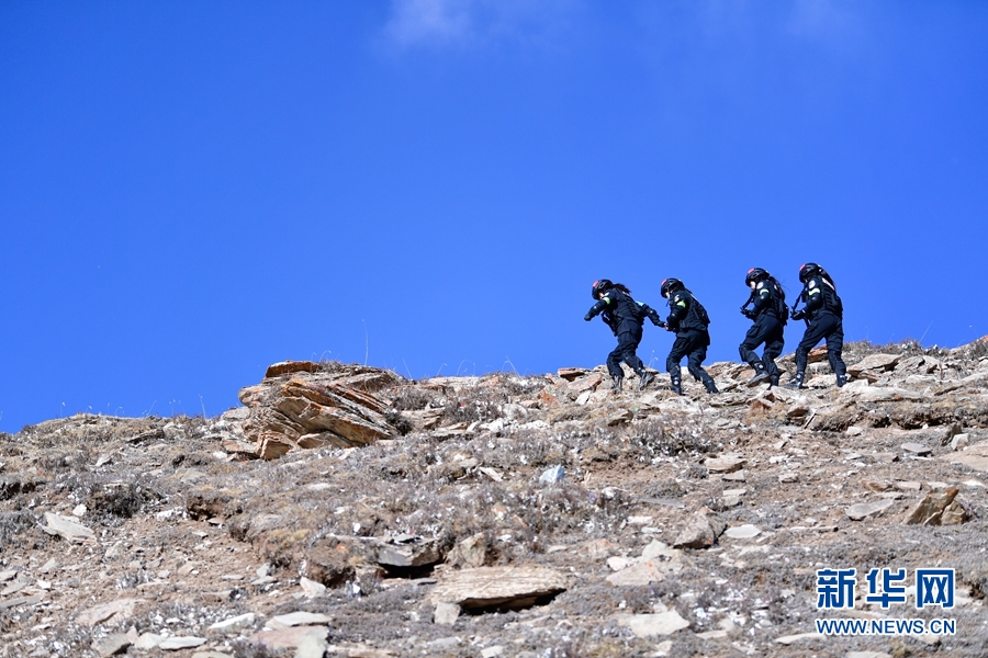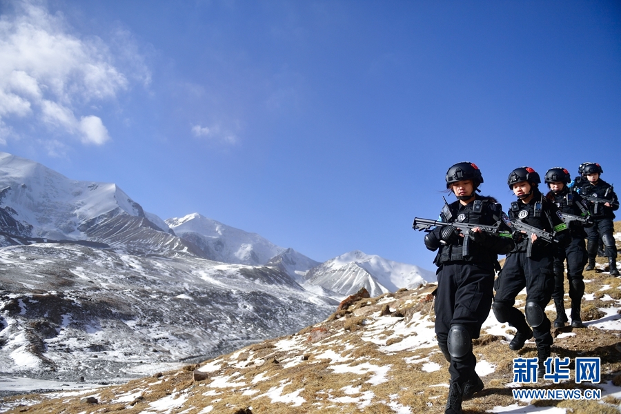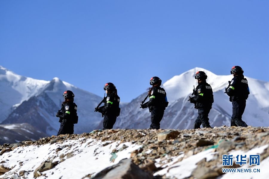 1月9日,青海省果洛藏族自治州公安局特警支隊直屬女子中隊的隊員們在阿尼瑪卿山腳下參加高原野外適應(yīng)性訓練。新華社記者 張龍 攝