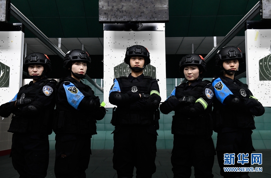 1月9日,青海省果洛藏族自治州公安局特警支隊直屬女子中隊的隊員在射擊訓練館合影。新華社記者 張龍 攝