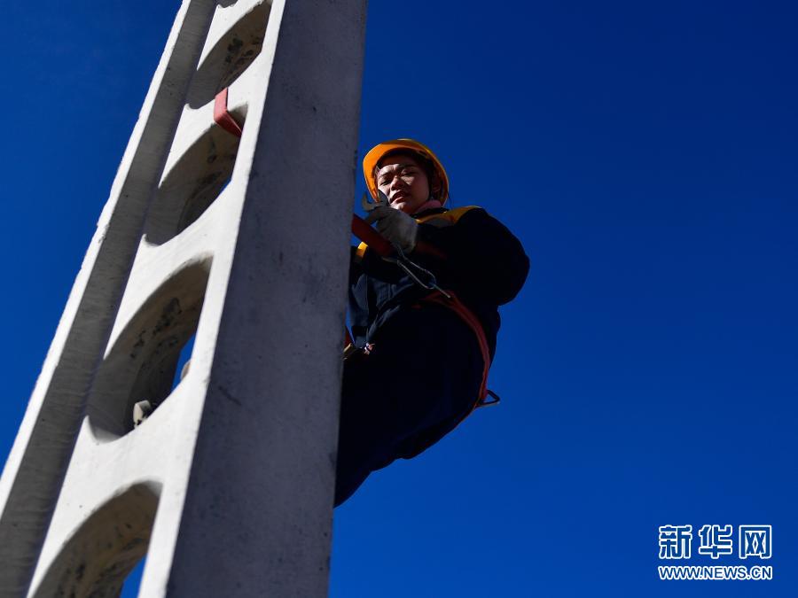 2月2日,在青藏鐵路公司西寧供電段哈爾蓋工區(qū)負責鐵路線上,羅露露在攀登接觸網(wǎng)支柱。新華社記者 張龍 攝