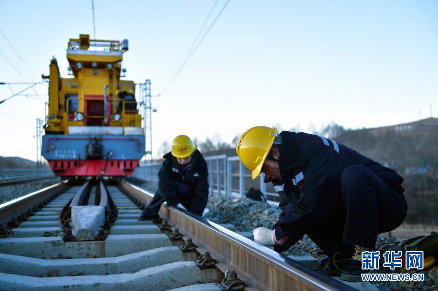 2月2日,在青藏鐵路公司西寧供電段哈爾蓋工區(qū)負責鐵路線上,羅露露在檢修螺絲。新華社記者 張龍 攝