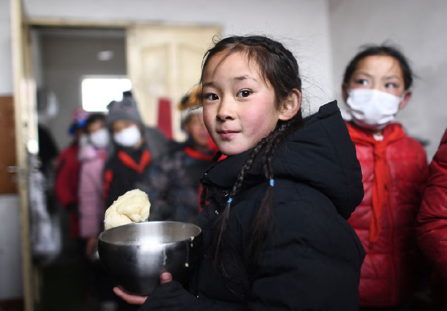 3月16日,在索加鄉(xiāng)寄宿小學(xué)食堂,格來達(dá)杰(前)在吃晚餐。新華社記者 韓方方 攝