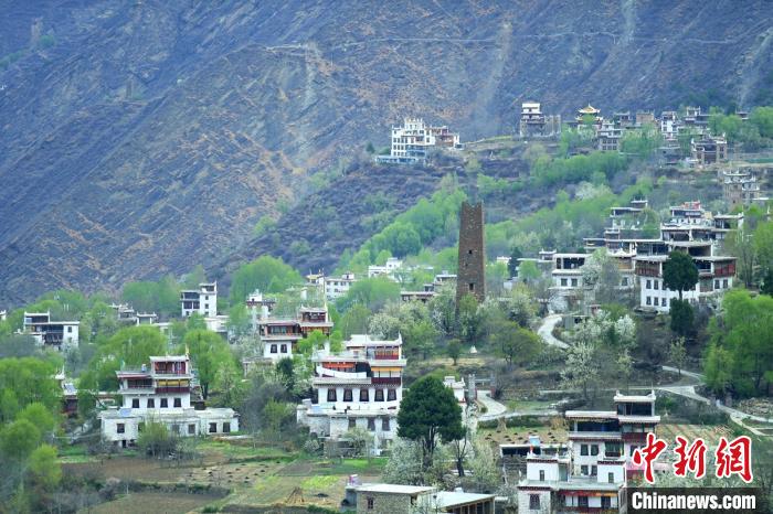 山坡上一幢幢藏式樓房灑落在梨花、綠樹叢中美如畫。劉忠俊 攝