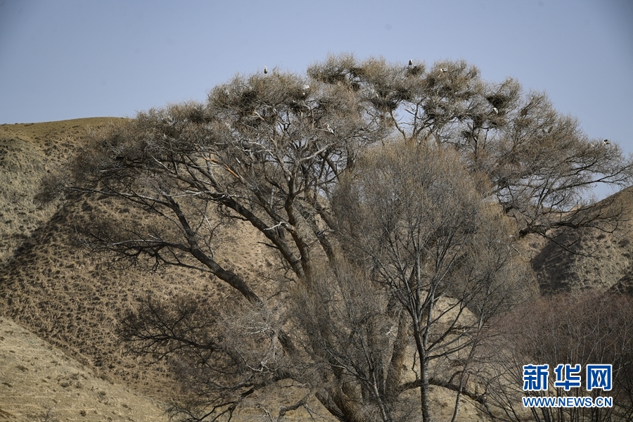 一群蒼鷺在貴德縣河?xùn)|鄉(xiāng)的一棵百年楊樹上嬉戲。新華網(wǎng) 潘彬彬 攝
