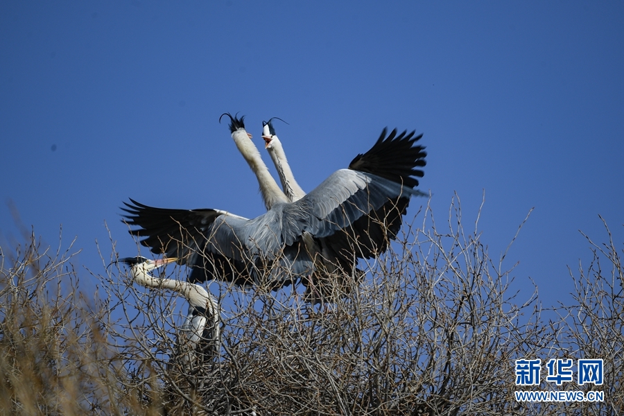 兩只蒼鷺來回飛舞忙碌建巢。新華網(wǎng) 卡婭梅朵 攝