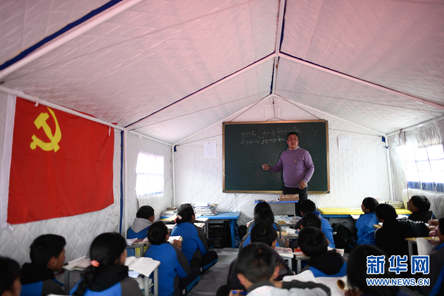 5月23日,李加才讓在瑪多縣民族寄宿制中學(xué)帳篷教室里上課。新華社記者 張龍 攝