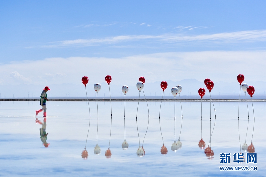 這是2020年9月23日拍攝的茶卡鹽湖“天空之鏡”景區(qū)一角(無(wú)人機(jī)照片)。新華社記者張龍攝