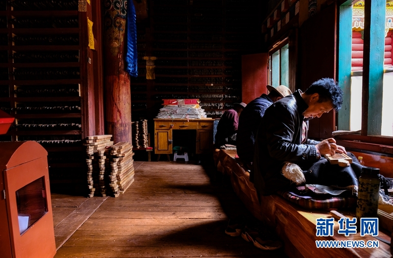藏族雕版印刷非遺傳承人在校對(duì)木刻版。新華網(wǎng) 張可凡 攝
