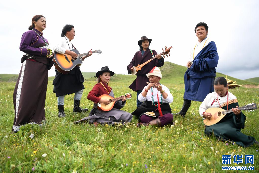 格薩爾彈唱藝人尕藏扎西(中)和同伴在瑪曲草原上彈唱格薩爾(7月14日攝)。新華社記者 杜哲宇 攝