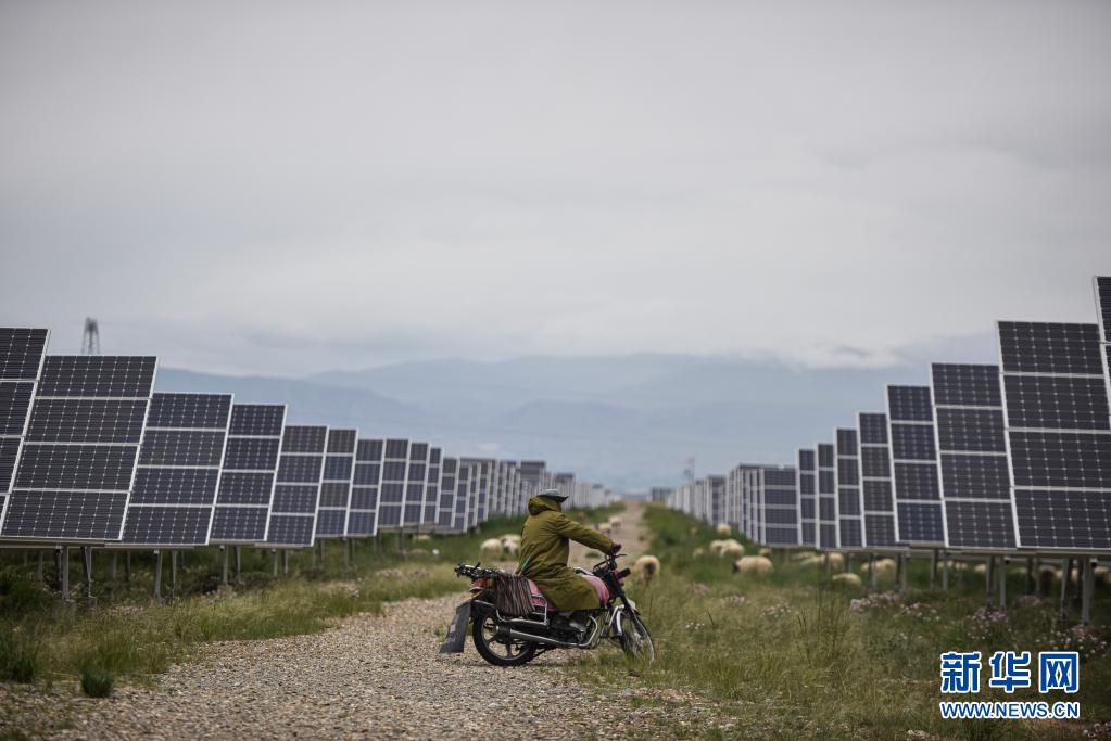 一名牧民在青海省海南藏族自治州共和縣光伏產(chǎn)業(yè)園區(qū)內(nèi)放牧(2019年6月16日攝)。新華社 吳剛 攝