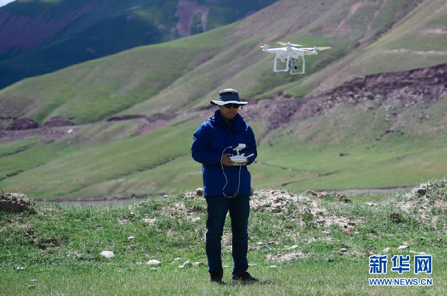 2021年長(zhǎng)江源綜合科考的科考隊(duì)員趙保成在使用無(wú)人機(jī)觀測(cè)長(zhǎng)江源地區(qū)生態(tài)環(huán)境(7月24日攝)。新華社記者 張龍 攝