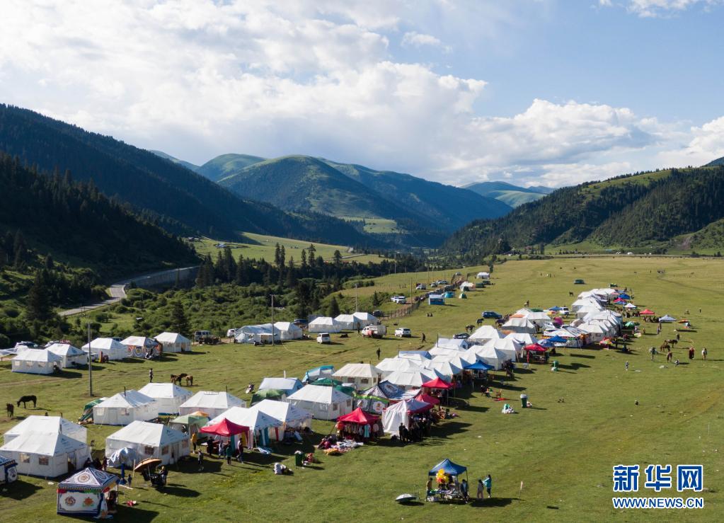 7月22日,人們?cè)诘梨诳h玉科草原上搭起帳篷休閑(無(wú)人機(jī)照片)。新華社記者 江宏景 攝