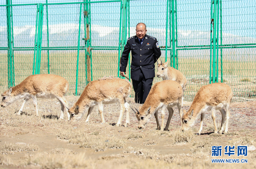 在可可西里國家級自然保護(hù)區(qū)索南達(dá)杰保護(hù)站,站長趙新錄與藏羚羊在一起(9月28日攝)。新華社記者 李占軼 攝