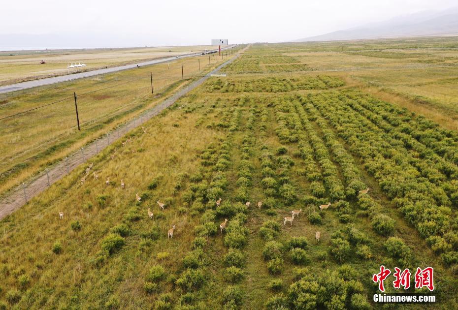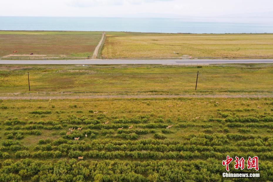 9月27日,在青海省海南藏族自治州共和縣青海湖國家級自然保護區(qū)南岸保護站,普氏原羚在草場內(nèi)進食。(無人機照片) 中新社記者 馬銘言 攝